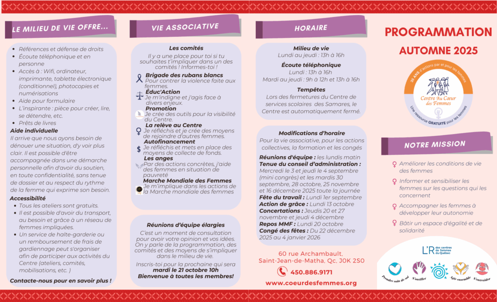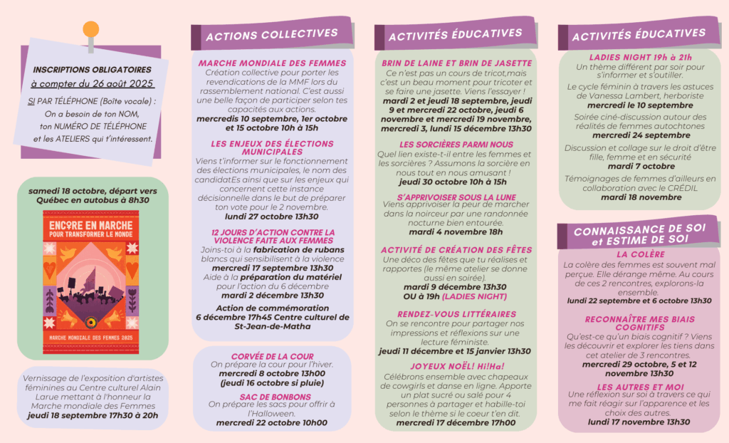 Les activités éducatives du Centre: il y a des ateliers de connaissance de soi et développement personnel, des ateliers de sensibilisation, d’éducation populaire autonome, d’information sur des sujets traitant de condition féminine ou de défense de droits. Des ateliers ludiques et de création, des sorties entres femmes ainsi que des actions collectives et des comités d’action pour s’impliquer et transformer la société.